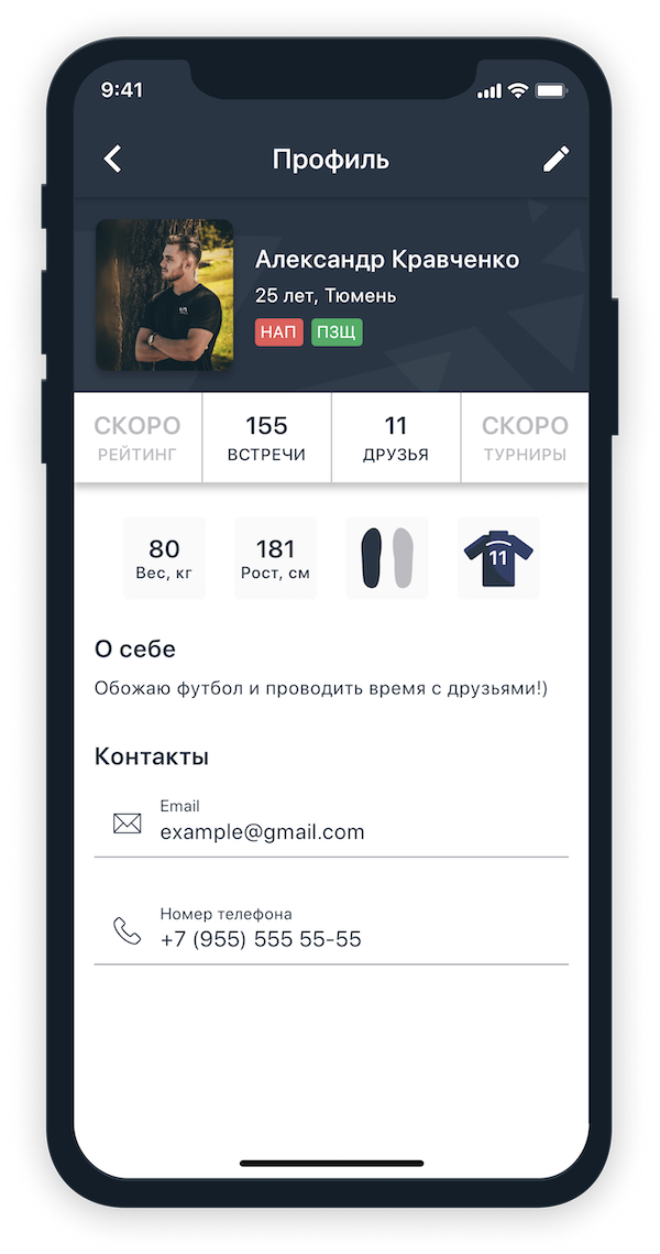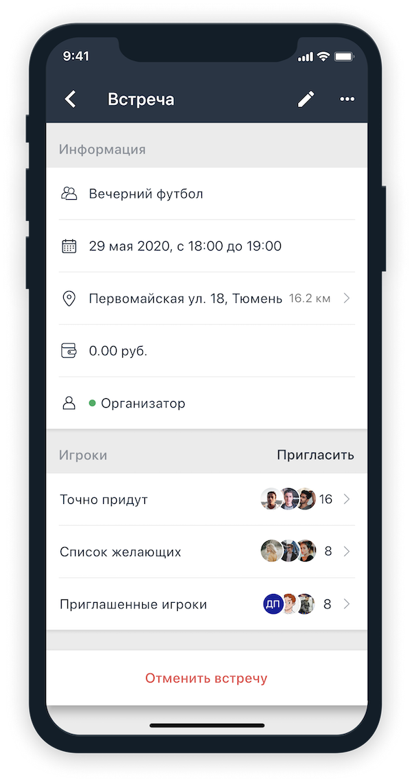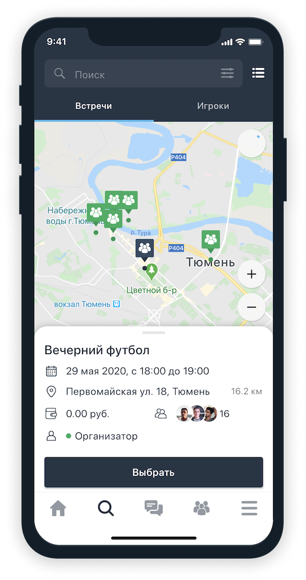 Теперь не будет проблем с поиском площадок для игр. Благодаря удобной футбольной карте твоего города, вопросы «Где?», «Когда?» и «с Кем?» отпадут навсегда. Моментально находи свободный зал, создавай встречу и делись с друзьями (или присоединяйся к другим командам). Собирайтесь как можно чаще!